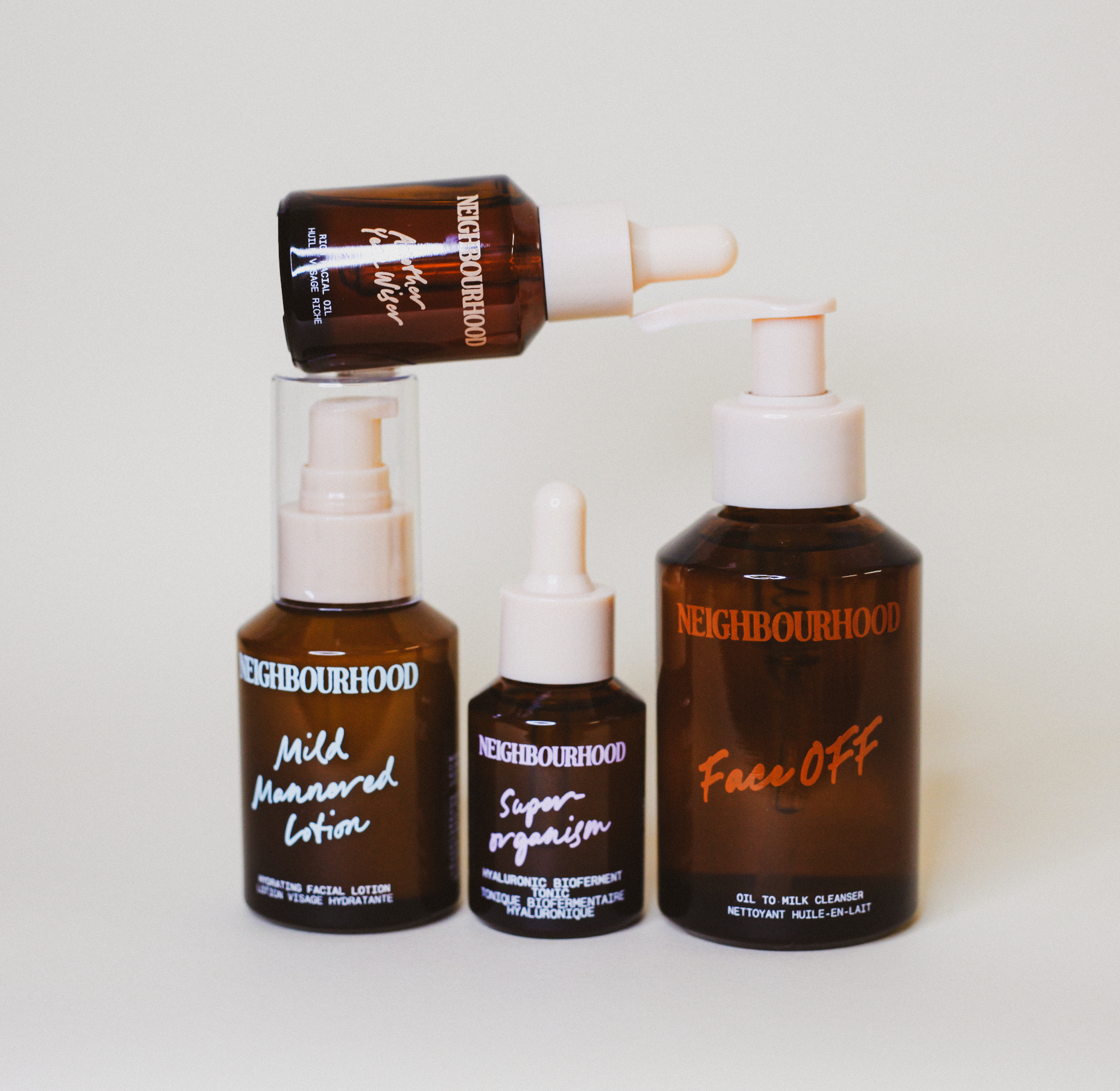Cleanse with Face Off to start or end your day. Apply Superorganism to damp skin, follow with Mild Mannered, then press in The Daily Glow each morning for that fresh, healthy-looking finish. A complete everyday ritual to keep your skin balanced, hydrated and glowing — the Neighbourhood way.